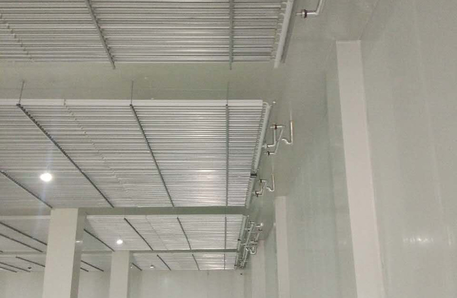 技術(shù)實(shí)現形式:低溫冷藏庫制冷系統采用1套比澤爾低溫螺桿三并聯(lián)制冷機組(3*HSN7471-75),1套3.5m3桶泵機組,2臺海密梯克冷媒泵,自動(dòng)熱氣化霜;¢26.4*2.0兩翅鋁排管,派克CK2系列氣動(dòng)截止閥,3間高溫保鮮庫制冷系統采用1套比澤爾高溫螺桿四并聯(lián)制冷機組(4*CSH6563-60),1套3.5m3桶泵機組,2臺海密梯克冷媒泵,水沖霜;吊頂式冷風(fēng)機,纖維布風(fēng)管送風(fēng)系統;高低溫系統共用1臺3m3高壓儲液器。